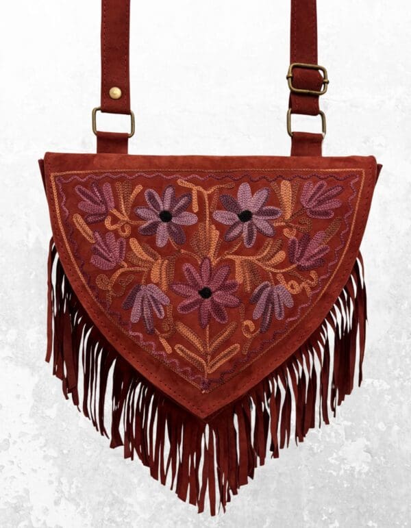Hecho en Cachemira por mujeres artesanas, el bolso Bindi está elaborado en piel vuelta color terracota y bordado a mano con la delicada técnica Aari, una tradición que honra la belleza hecha con calma. Las flores en tonos púrpura, lavanda y coral se dibujan sobre el fondo cálido como una pequeña celebración de la feminidad.
