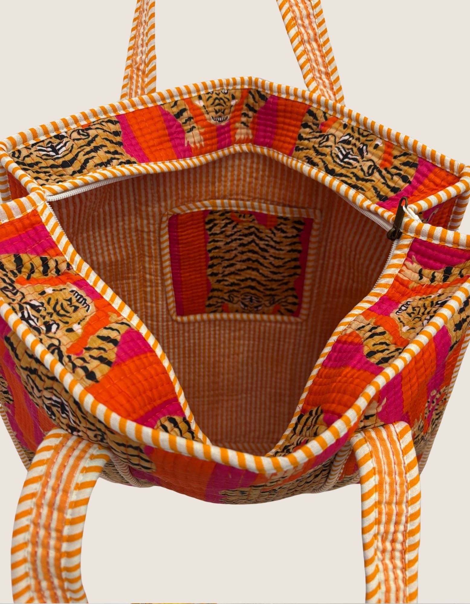 Descubre nuestros tote bag de 100% algodón , perfecto para cualquier ocasión. Con un estampado  de tigres y rallas, con cremallera y asas reforzadas, combina estilo, funcionalidad y sostenibilidad. Su amplio espacio y bolsillo interior  lo hacen ideal para el día a día.