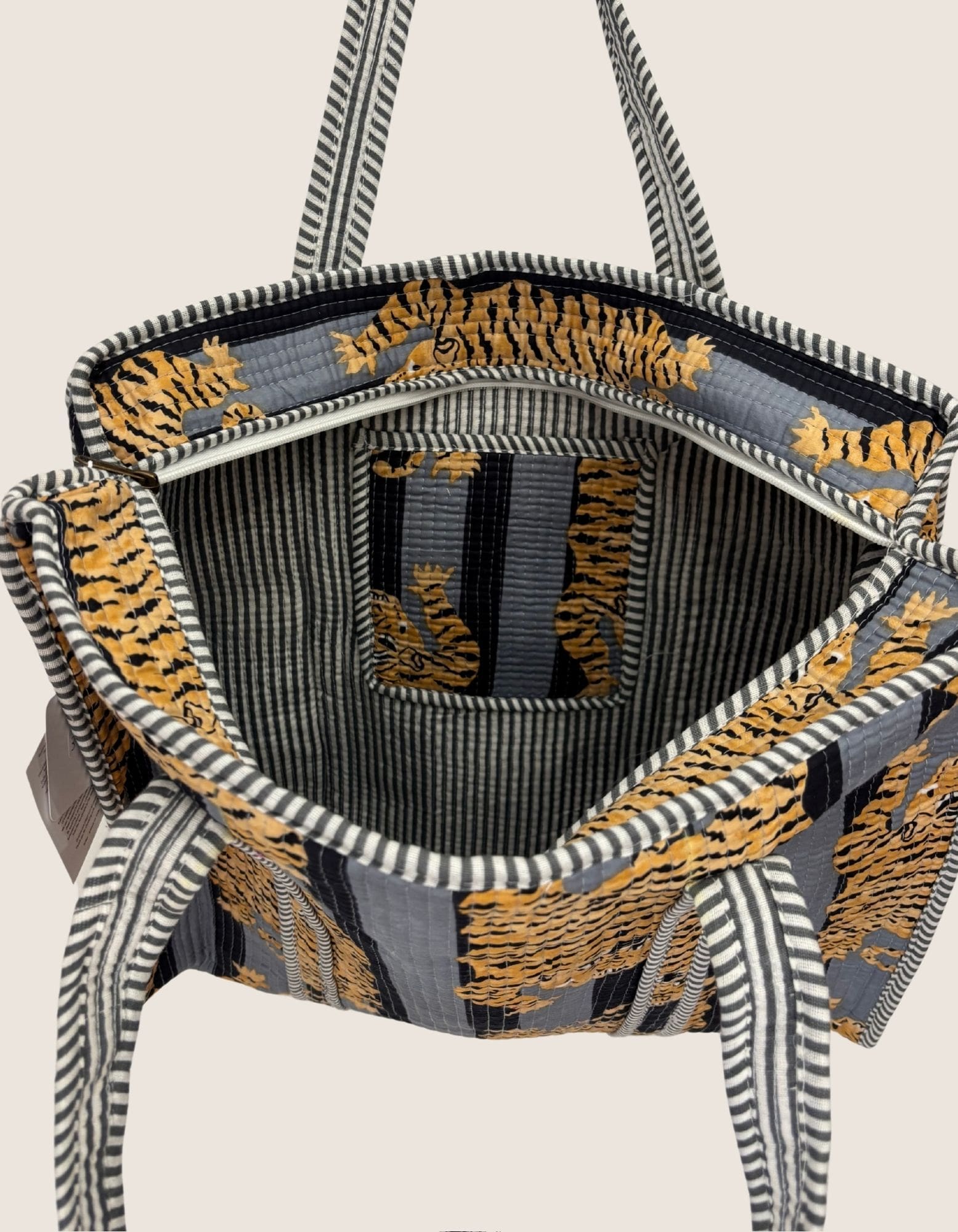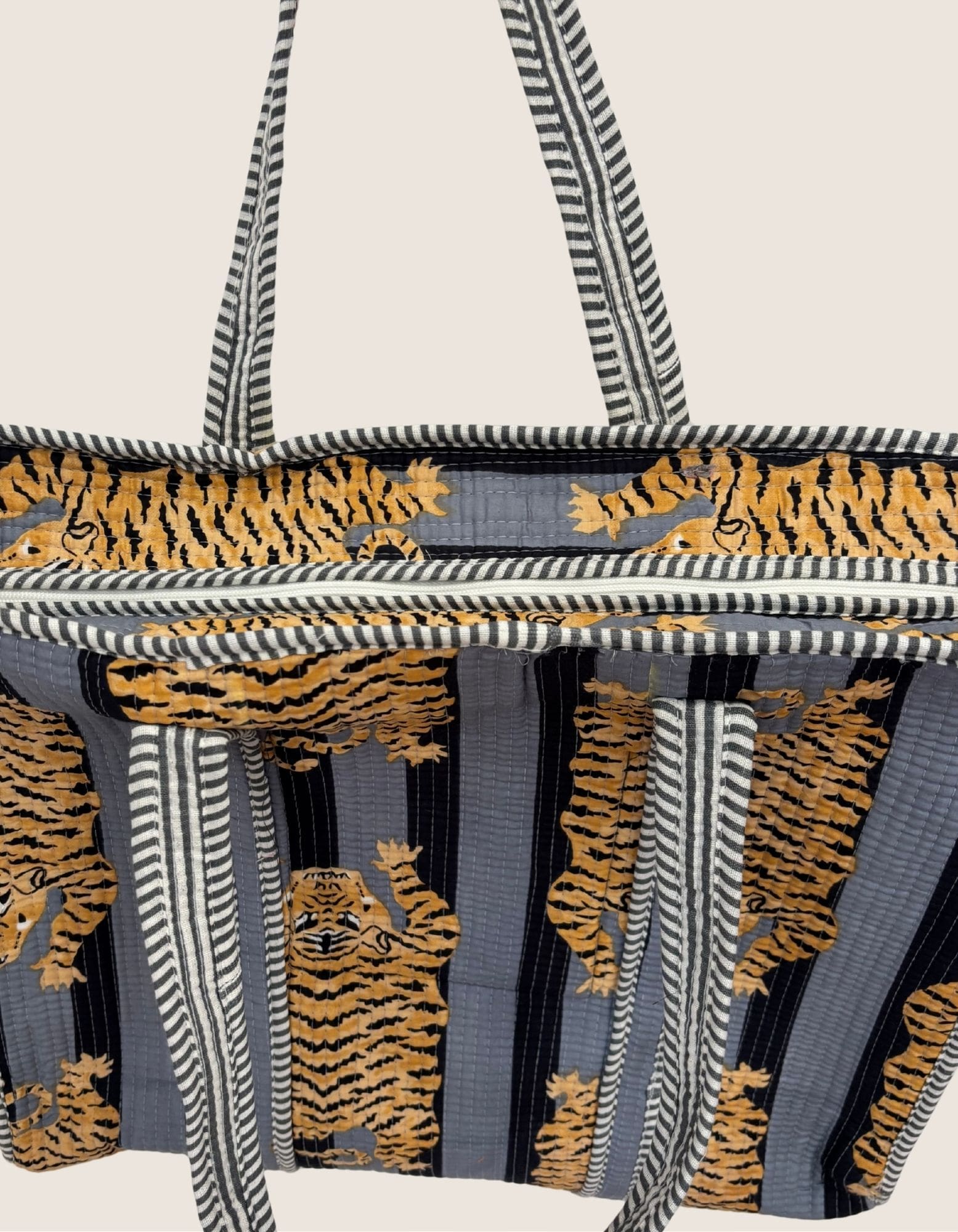 Descubre nuestros tote bag de 100% algodón , perfecto para cualquier ocasión. Con un estampado de tigres y rallas, con cremallera y asas reforzadas, combina estilo, funcionalidad y sostenibilidad. Su amplio espacio y bolsillo interior lo hacen ideal para el día a día.
