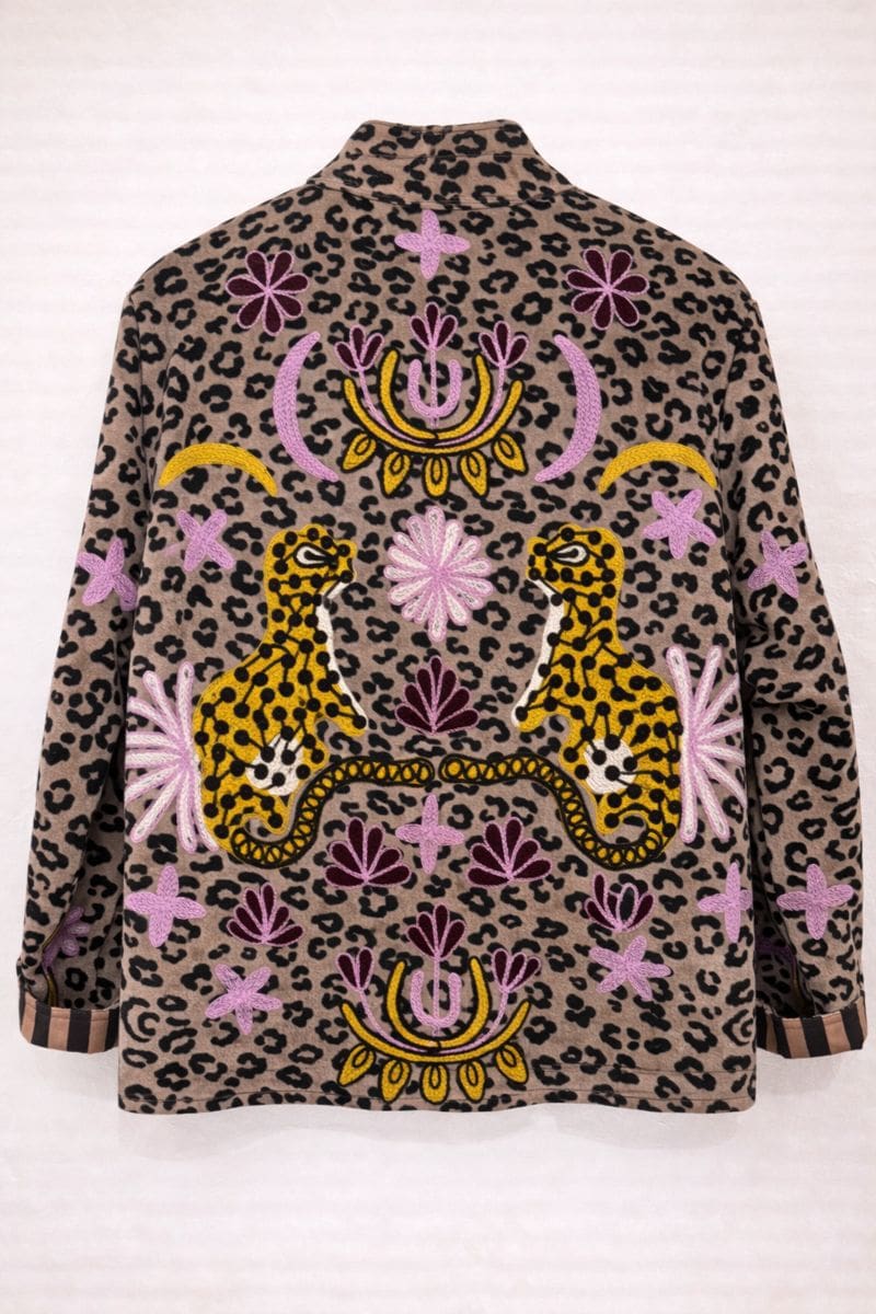 Chaqueta artesanal hecha en la India con un espectacular estampado animal print y un bordado vibrante en tonos fucsia, rojo y dorado que le da un aire único y muy potente.