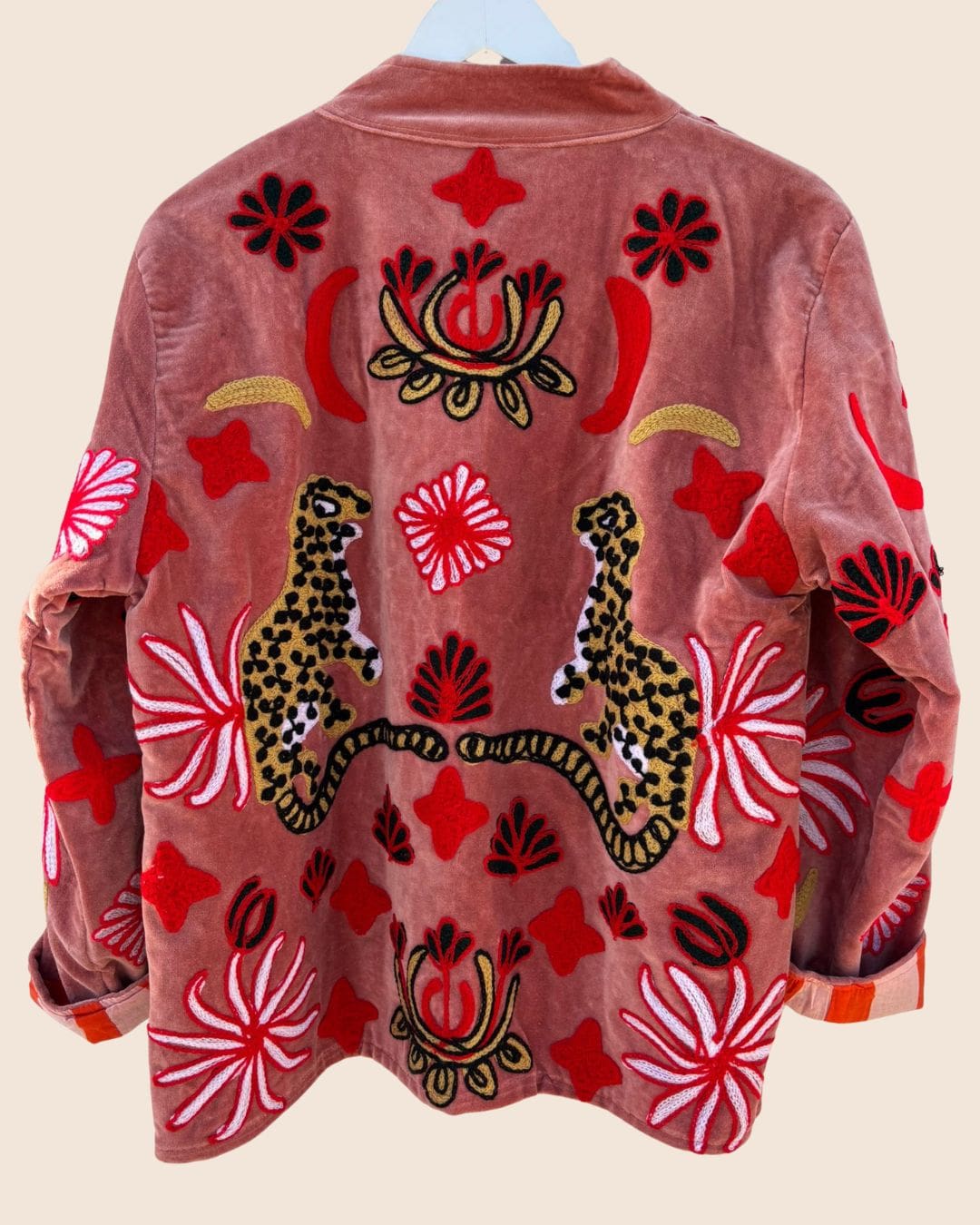 El terciopelo suave sirve como base para un diseño lleno de color, movimiento y simbolismo: motivos florales, formas orgánicas y los icónicos leopardos bordados en la espalda, que aportan fuerza y personalidad.