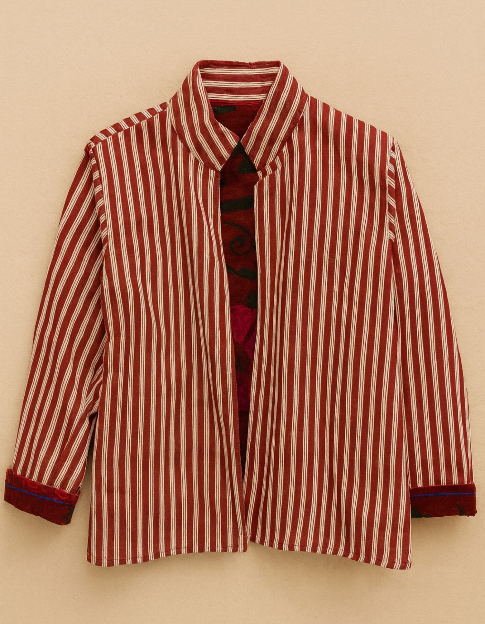 La Chaqueta Suzani Burdeos está elaborada en suave terciopelo burdeos y destaca por sus bordados artesanales en tonos fucsia, rojo intenso, verde bosque y toques turquesa. El diseño evoca jardines orientales y frutos de granada, símbolo de abundancia y vitalidad.