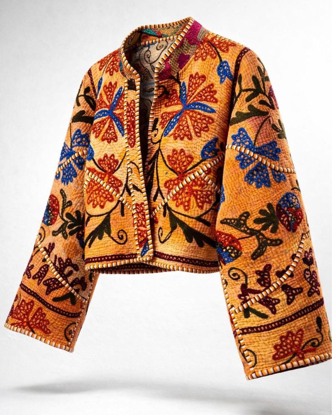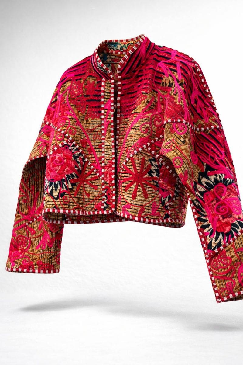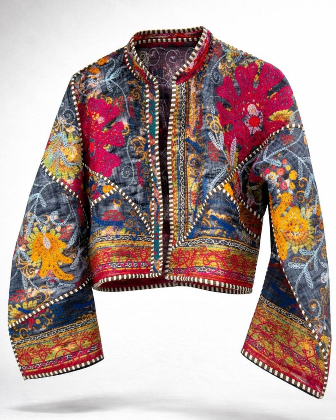 Chaqueta de algodón bordada a mano con llamativos motivos florales en fucsia y turquesa sobre base azul índigo.