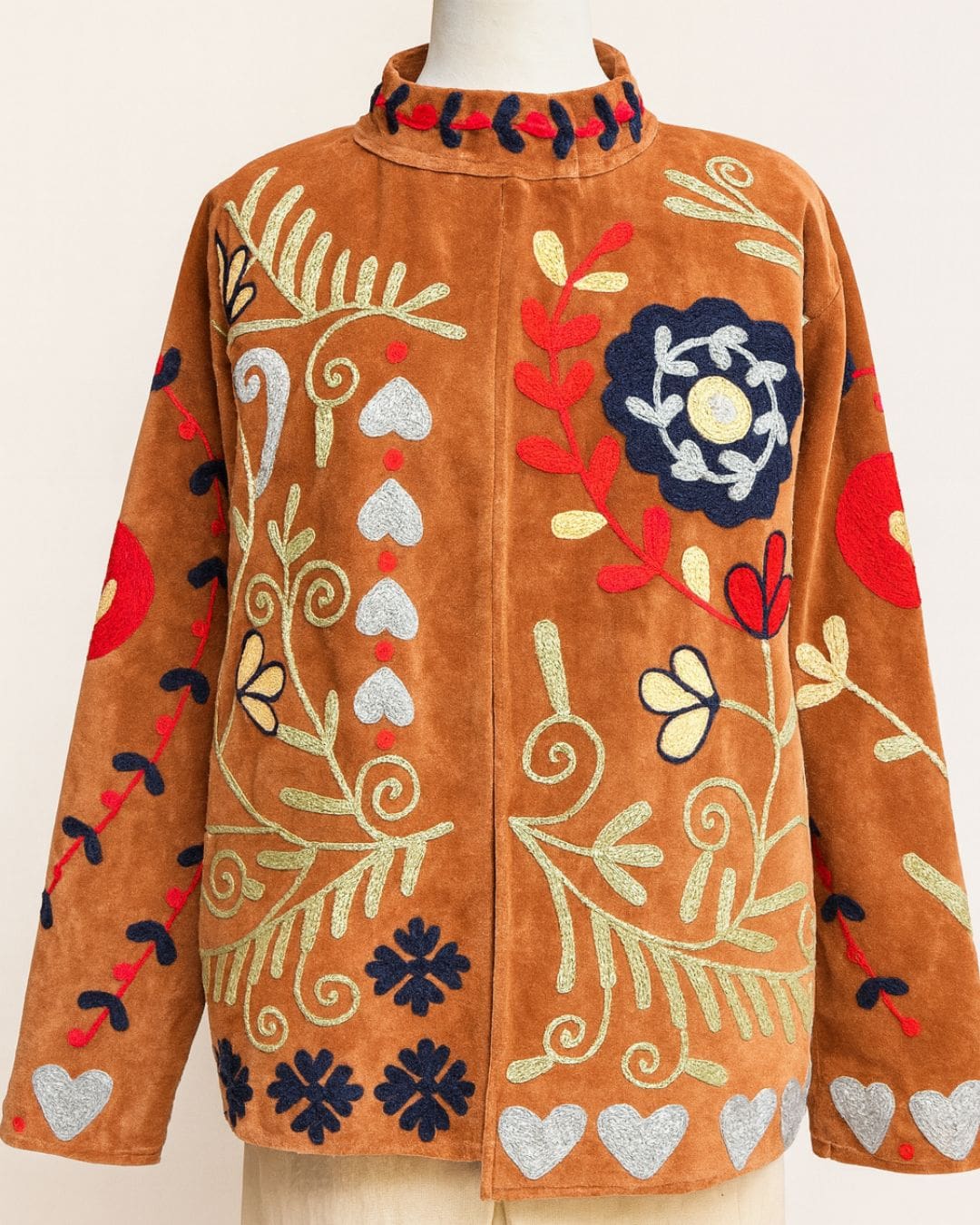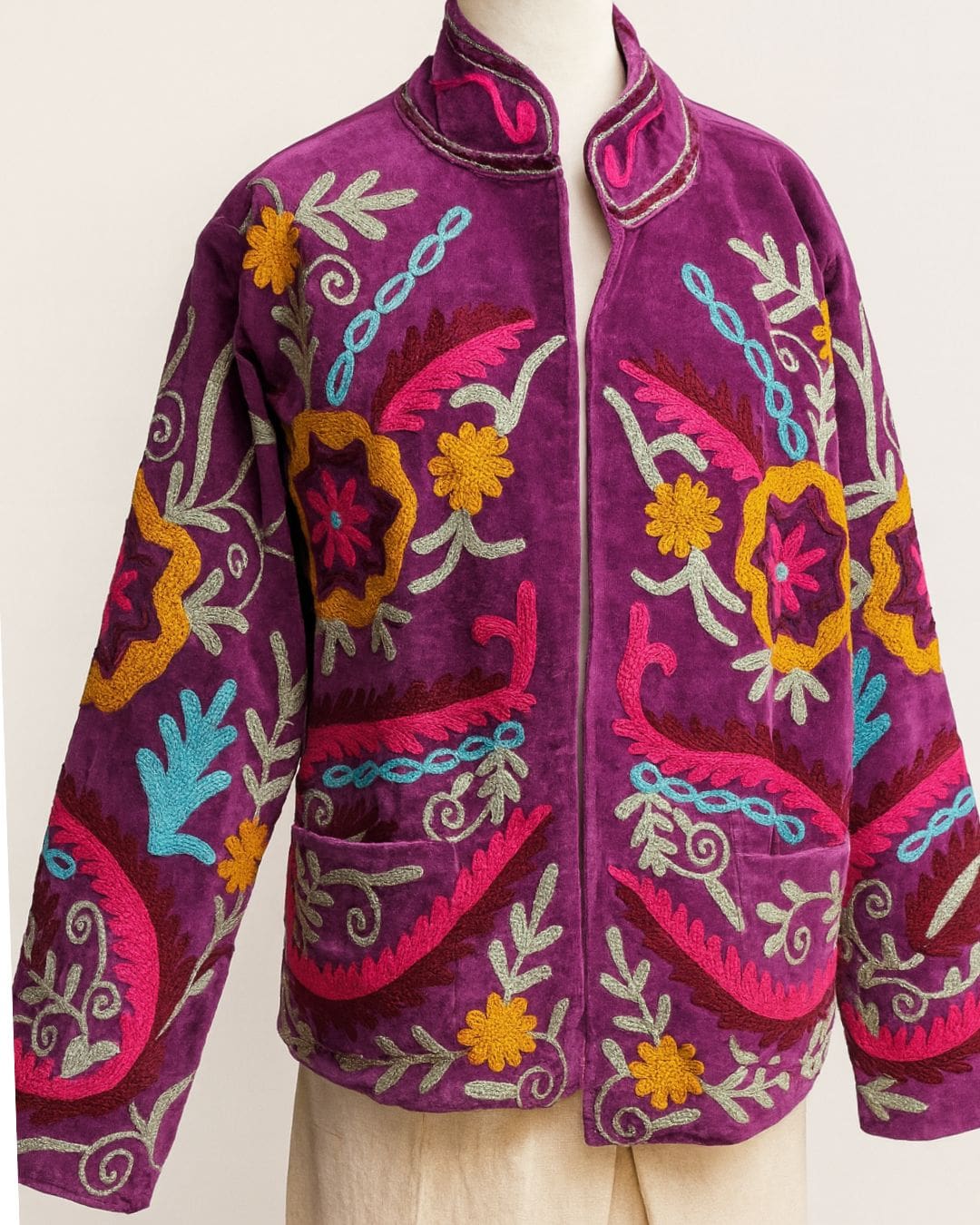 Chaqueta artesanal de algodón con exquisito bordado Suzani en tonos mostaza, granate, verde oliva y azul grisáceo sobre fondo crudo.