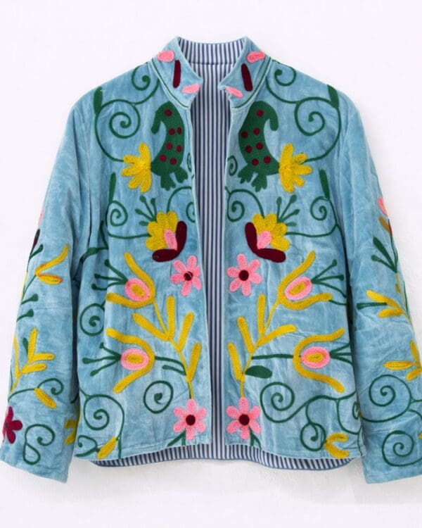 Chaqueta artesanal de edición limitada confeccionada en terciopelo bordado, con interior de algodón a rayas.