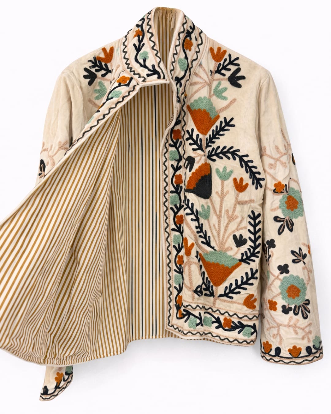Chaqueta artesanal de edición limitada confeccionada en terciopelo bordado, con interior de algodón a rayas.