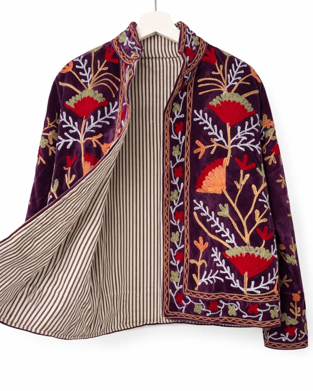 Chaqueta artesanal de edición limitada confeccionada en terciopelo bordado, con interior de algodón a rayas.