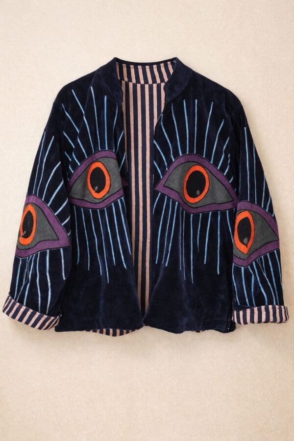 Chaqueta de terciopelo y algodón reversible en tono azul profundo, bordada con un motivo central de ojo protector, símbolo ancestral de intuición, fuerza y protección. El bordado, realizado con hilo grueso en tonos fucsia, azul claro y naranja, crea un contraste muy gráfico sobre el velvet, aportando carácter y presencia.