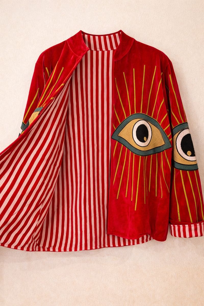 Chaqueta de terciopelo y algodón en tono rojo profundo, bordada con un motivo central de ojo protector, símbolo ancestral de intuición, fuerza y protección. El bordado, realizado con hilo grueso en tonos crudo, negro y verde agua, crea un contraste muy gráfico sobre el velvet, aportando carácter y presencia.