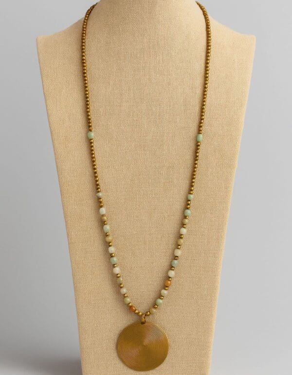 Collar artesanal hecho a mano en la India con cuentas de ágata natural en tonos tierra y verde suave, combinadas con detalles en bronce envejecido. El diseño culmina con un colgante redondo de bronce grabado, que aporta carácter y un aire bohemio a cualquier look.
