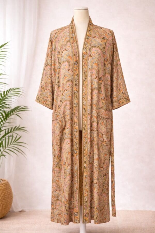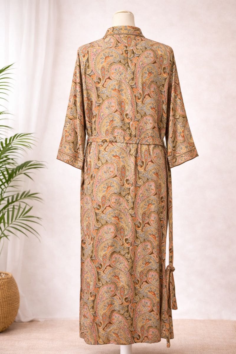 Kimono largo de inspiración india, fluido y ligero, pensado para acompañar el movimiento del cuerpo.