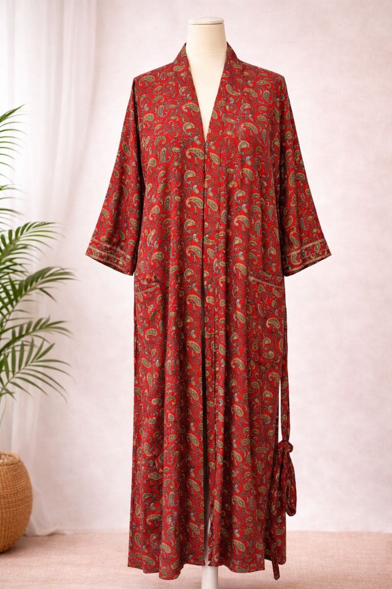 Kimono largo de inspiración india, fluido y ligero, pensado para acompañar el movimiento del cuerpo.