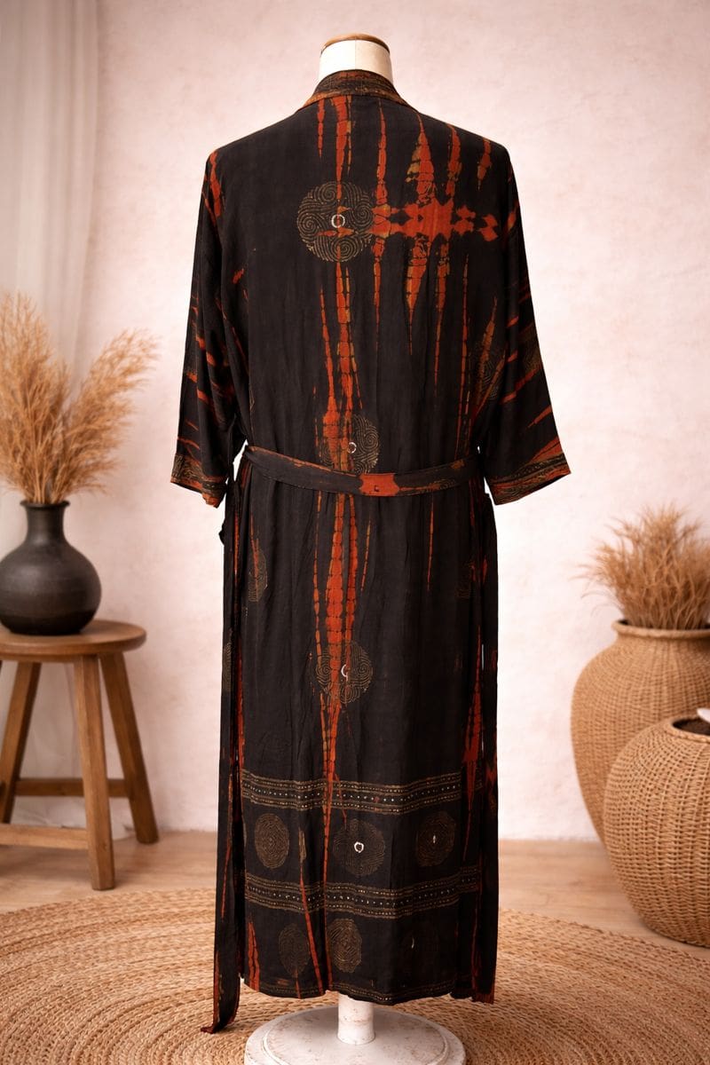 Kimono largo de seda crepé , teñido a mano con técnica tie-dye en negro y marrón anaranjado. Cada pieza ha sido bordada artesanalmente.