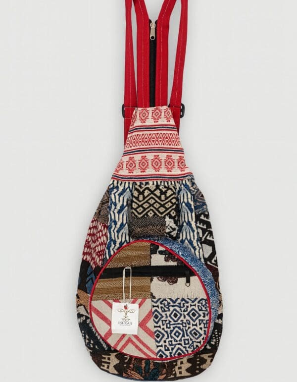 Mochila de cáñamo y algodón hechas en Nepal, cierra con una cremallera y en la parte posterior tiene dos bolsillos exteriores frontales, uno pequeño  y otro más grande con cremallera. Disponible varios estampados.