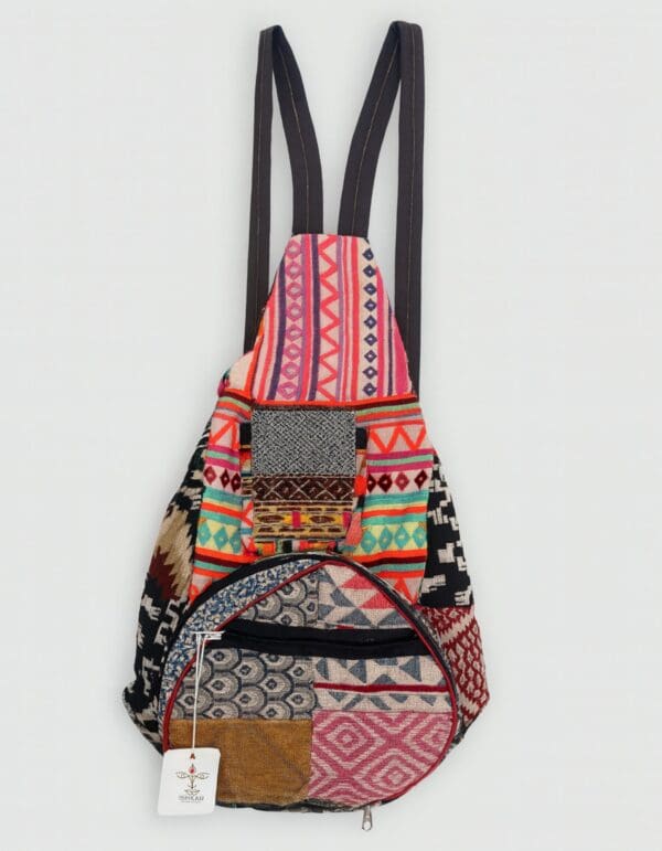 Mochila de cáñamo y algodón hechas en Nepal, cierra con una cremallera y en la parte posterior tiene dos bolsillos exteriores frontales, uno pequeño  y otro más grande con cremallera. Disponible varios estampados.